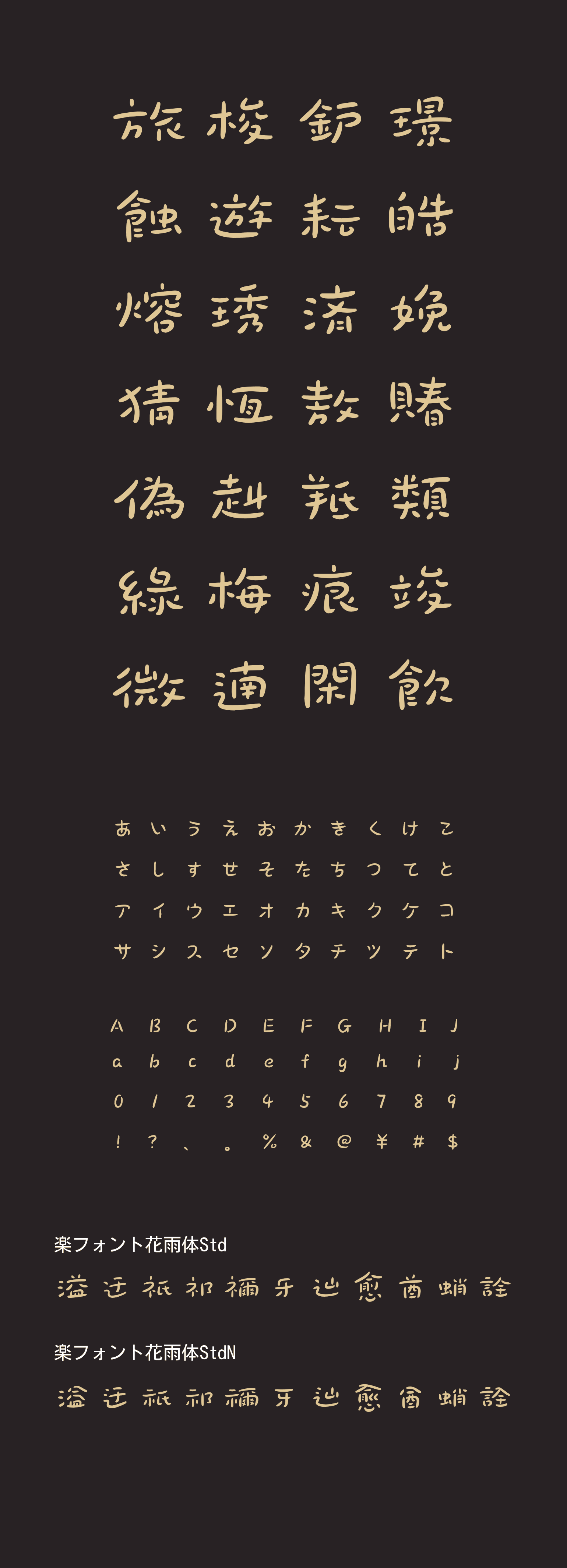 巧緻な字画、風になびく花びらのように小さく繊細な筆遣いが特徴です。全体的な感触はスマートで繊細、目を楽しませてくれます。 絵本、動画配信、パッケージデザインや広告のコピー、看板などに使えます。