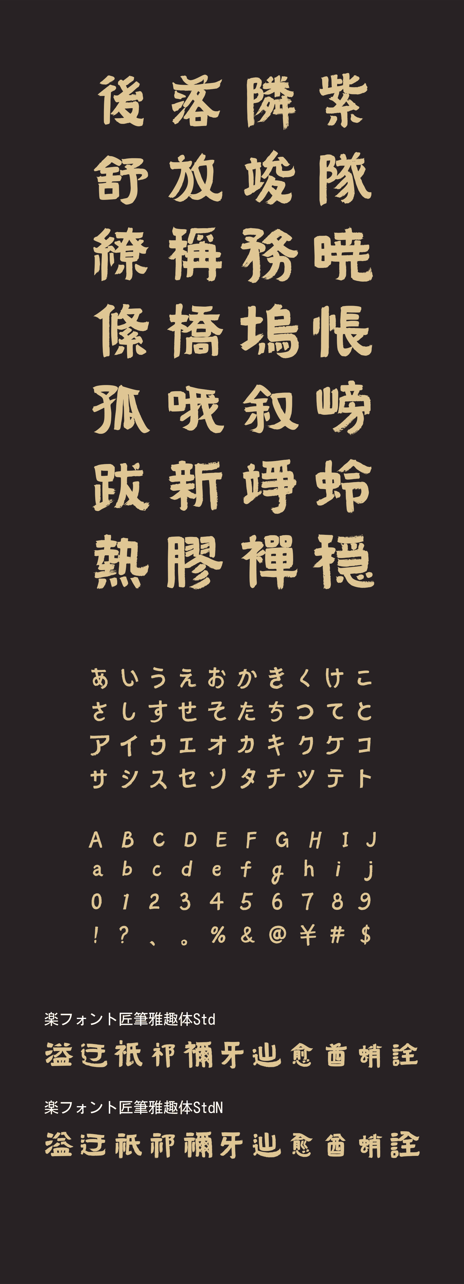 古隷書体を基にデザインされた古風のフォントです。書写特有の飛白を残し、字形と筆画の間に適度な余白を設けています。筆致は生き生きとしており、素朴さの中に巧みさが感じられます。伝統的な字形の枠を超え、現代アートを融合させた、書道美あふれるフォントです。