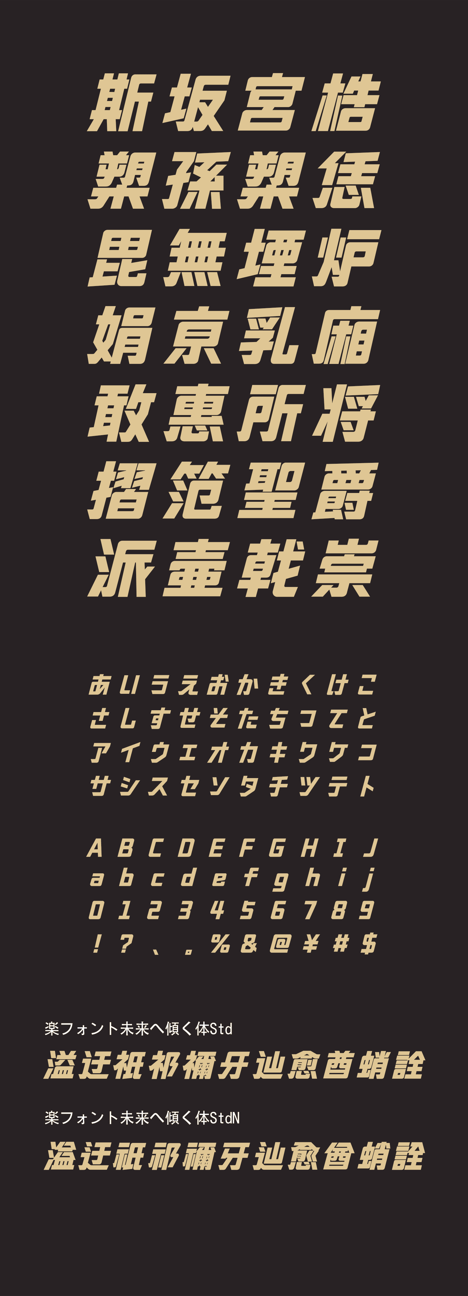 前傾した骨格と鋭いエッジが生み出す、スピード感と力強さが特徴のフォントです。引き締まった文字形が動きを強調し、スポーツ系デザインやアクションタイトル、ゲームUI、近未来的なビジュアルに最適です。
