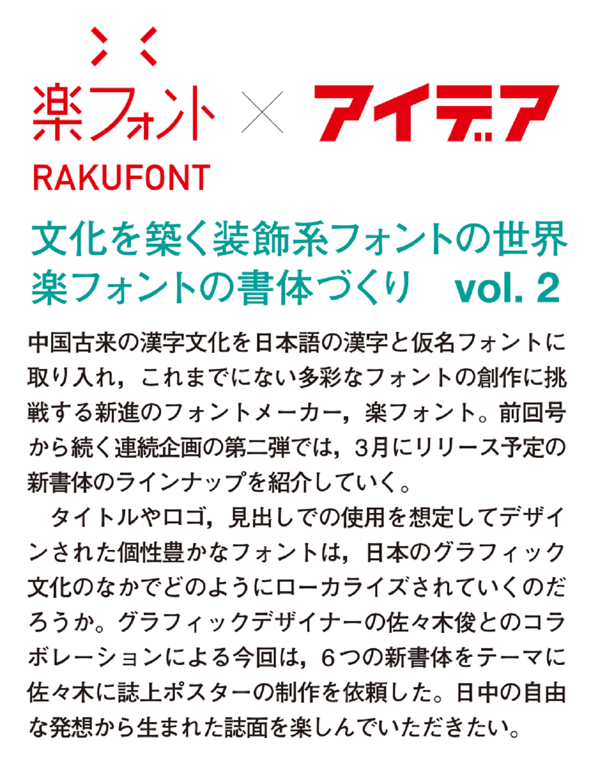 弊社新書体の紹介とグラフィックデザイナーの佐々木俊さんと弊社フォントのコラボレーションページがございます。